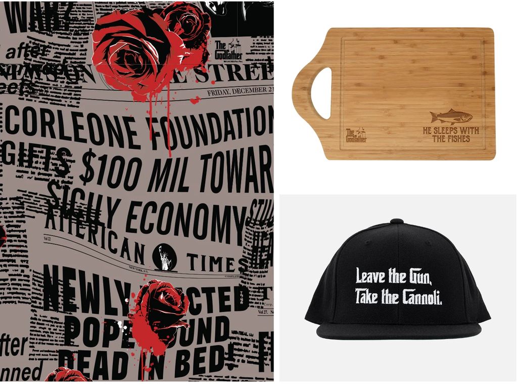 In these examples, I ran an exploratory to bring the dark wit and wisdom of The Godfather to new product categories: a warm blanket featuring coldly knowing in-world headlines, a cutting board for chefs who get it, and a hat featuring classic culinary advice.
