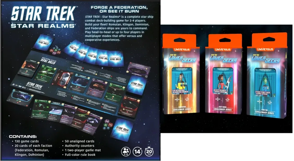 Star Trek Games: To bring Star Realms to life with UVS Games, I dove deep into the property mythology to put players in command of Federation, Klingon, Romulan, and Dominion ships in a series-spanning, strategic deck-building game. For more light-hearted play, we developed a card game based on the animated series Lower Decks, in which I wrote character lore off memorable show beats.