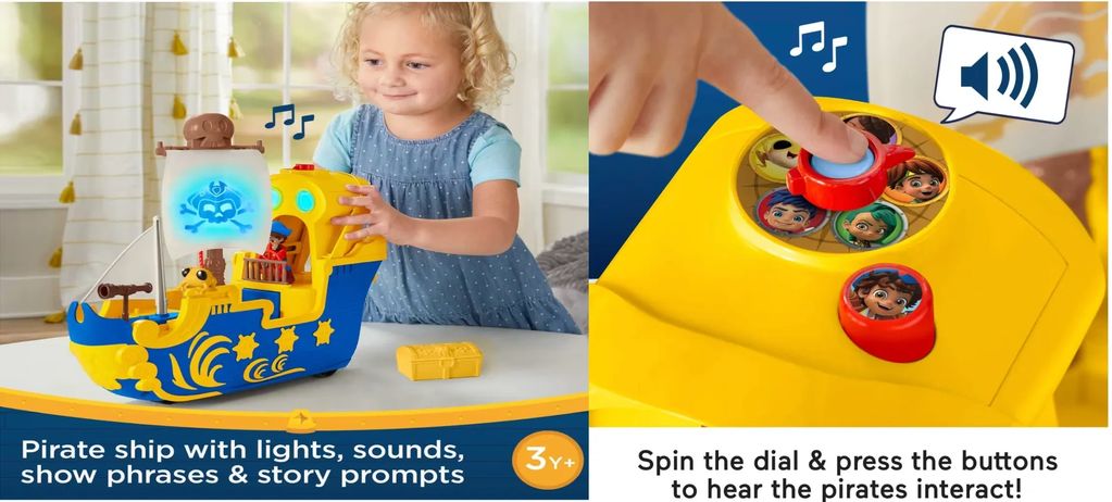 Santiago of the Seas Lights & Sound Playset Pirate Ship: I wanted to push Fisher-Price to do more than a mere playset. I plussed up the concept and script by integrating story prompts to bring over 50 episodic adventures to life, all while teaching Spanish. This innovative product introduced key characters and adventures during the property launch year. ¡Increíble!