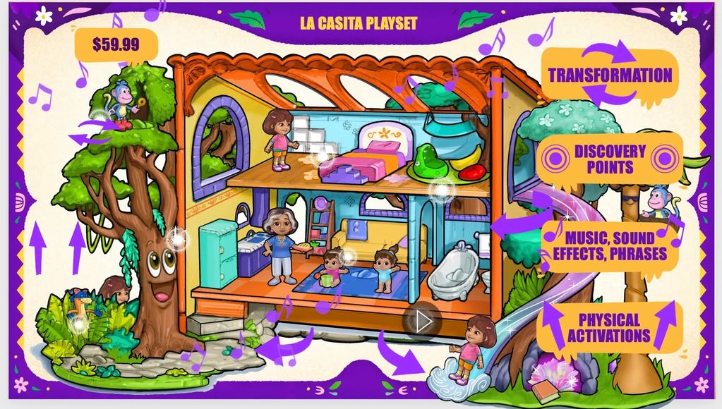 Dora Toy Line Fall 2024: I worked alongside Toy to create the initial line for the Dora relaunch. At its center is a concept that goes beyond a dollhouse, allowing kids to explore Dora's world. The "Dora Difference" involves inclusion of key characters, locations, and props, electronics to deliver episodic content and Spanish, as well as adventure content in the magical rainforest surroundings.